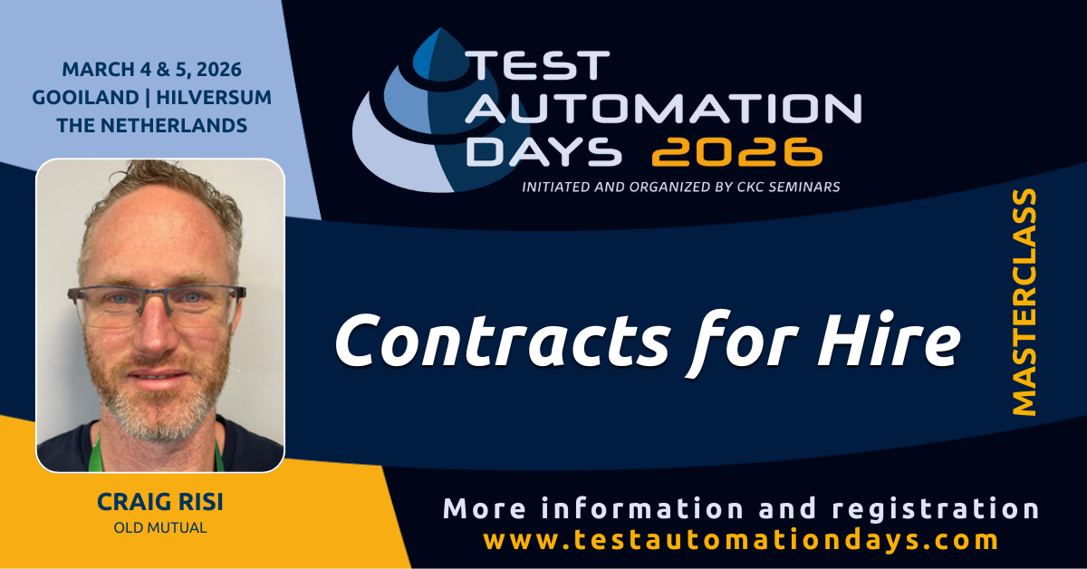 Test Automation Days is the key meeting place for: IT Management such as CIOs, CTOs and IT Managers, IT Professionals such as Engineers, Analysts, Developers, Specialists, Integrators, Test coordinators and Test managers and Business Management such as Consultants, Software suppliers and Project managers