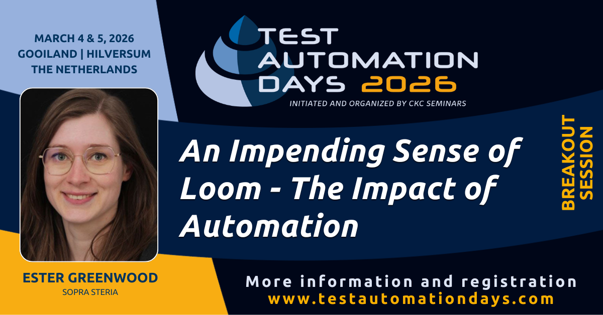 Ester Greenwood, Test Engineer, Sopra Steria will host the session “An Impending Sense of Loom – The Impact of Automation” that will take place on Thursday March 5.