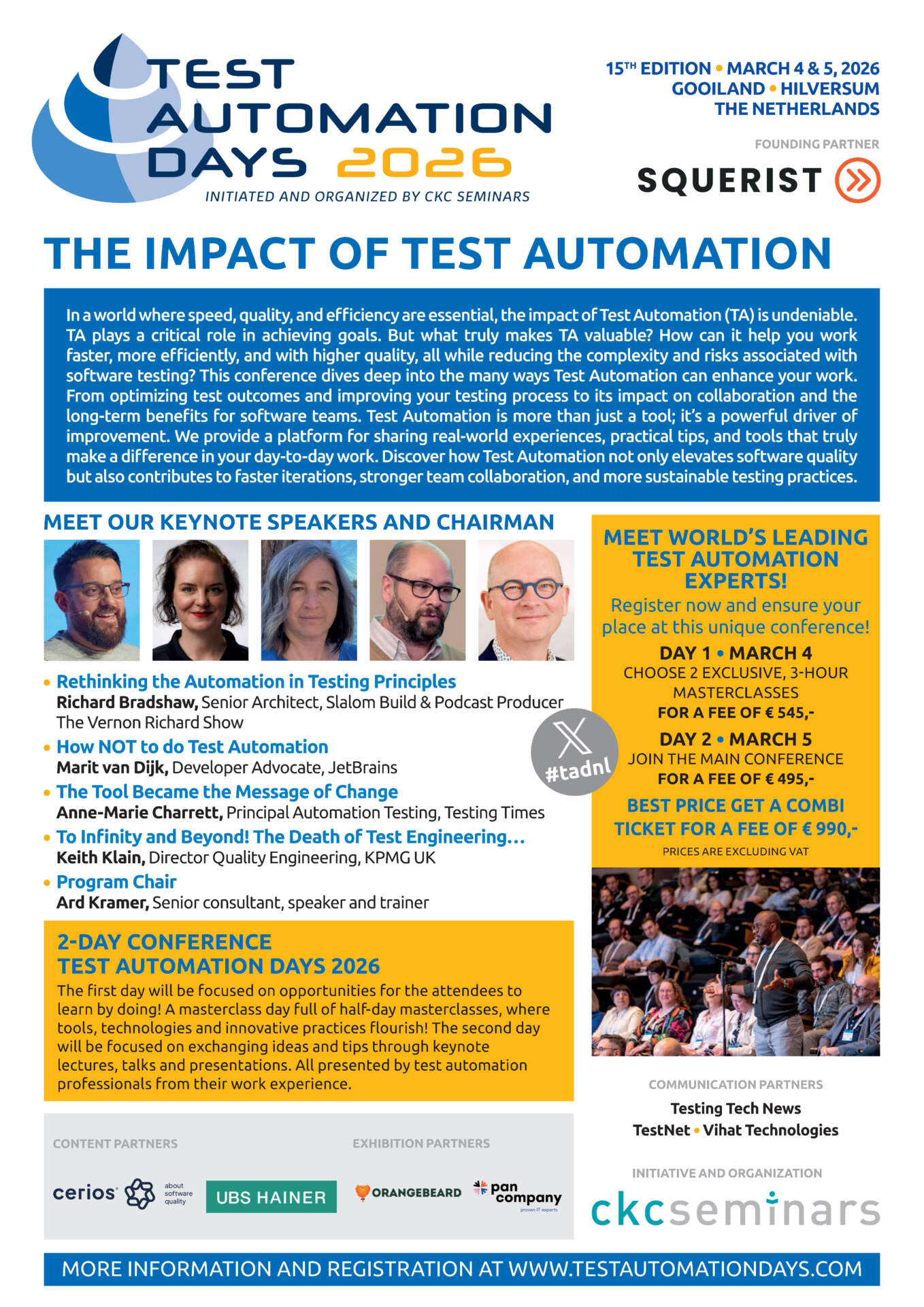 We proudly announce the two day program of Test Automation Days 2026 which will be held on March 4 and 5 in Hilversum, The Netherlands. The theme of the 15th edition is The Impact of Test Automation.