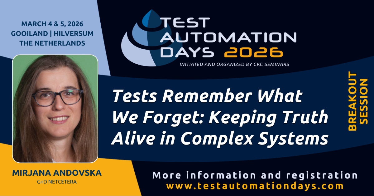 Mirjana Andovska, QA Architect, G+D Netcetera will host the session “Tests Remember What We Forget: Keeping Truth Alive in Complex Systems” that will take place on Thursday March 5.